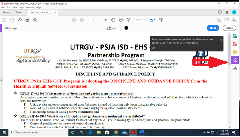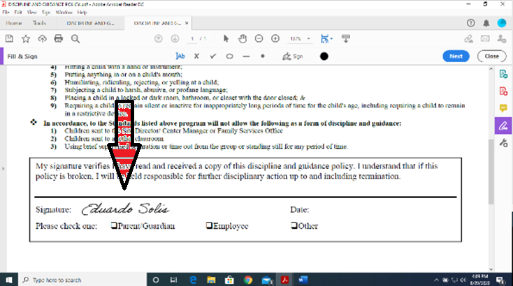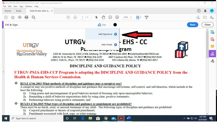 Refer to the illustration below for step by step instructions on how to sign the document. Adobe Reader DC is required. You can download it free by clicking on the Adobe Icon.